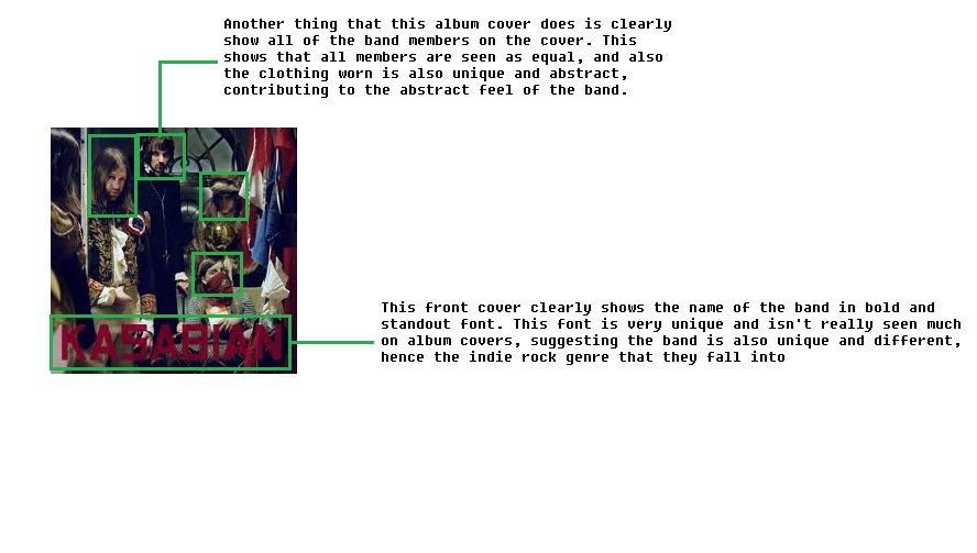 Also, some of the CD's do use some sort of abstract features in the CD cover. Kasabian and Kings of Leon both use abstract features in their CD cover, either in the clothing worn by the band members, or the way they are presented, with the Kings of Leon album presenting the band members as part of an eagle head.